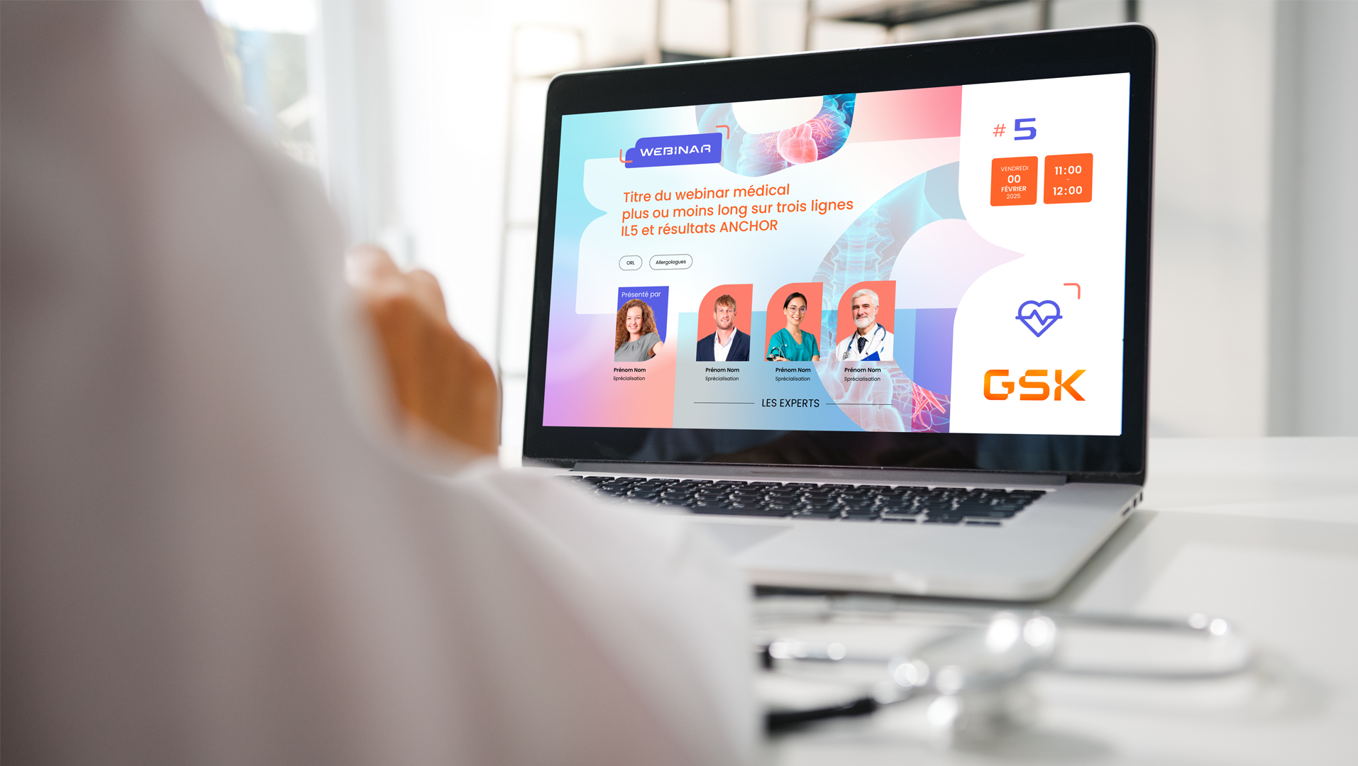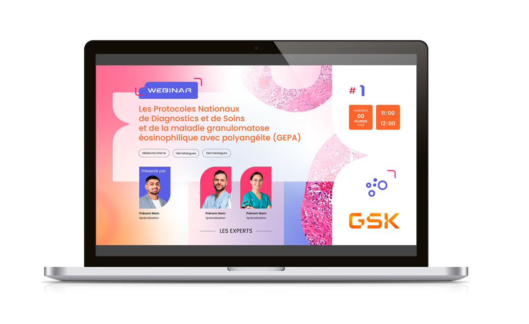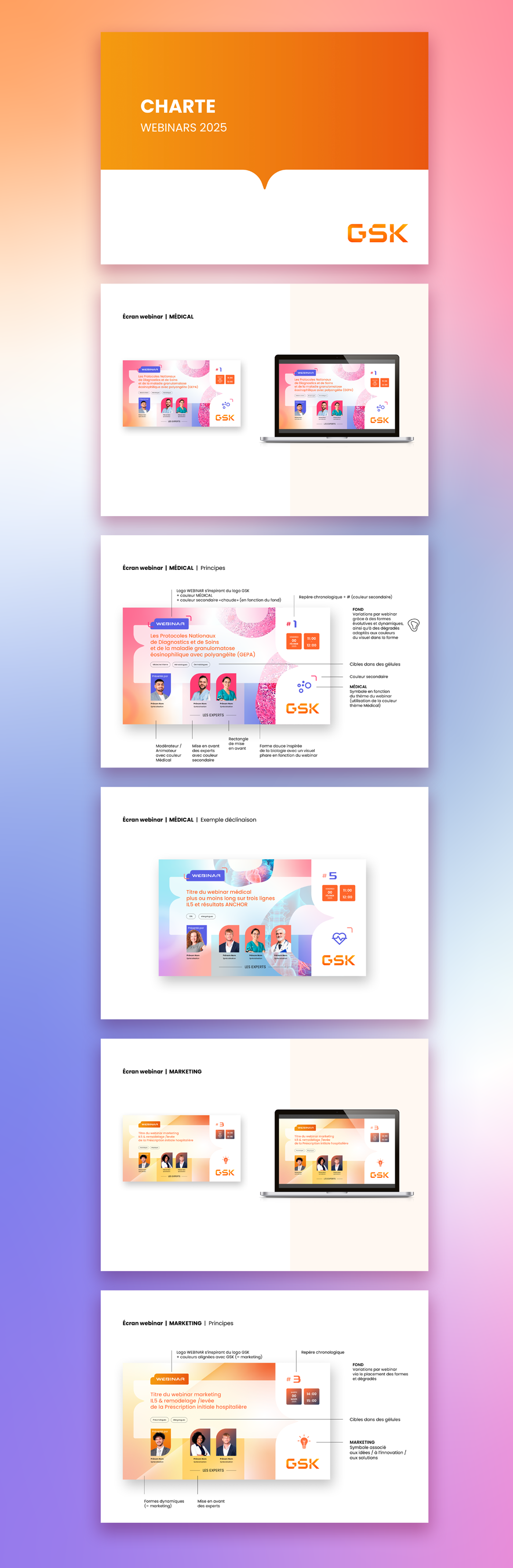 J'ai conçu un système graphique simple et modulable, comprenant un logo webinar avec typographie sur mesure, inspirée du logo GSK, ainsi qu'un ensemble d'écrans déclinables (codes couleurs, thèmes, invités, etc.) permettant de différencier les webinars médicaux et marketing tout en s'adaptant aux spécialités abordées.