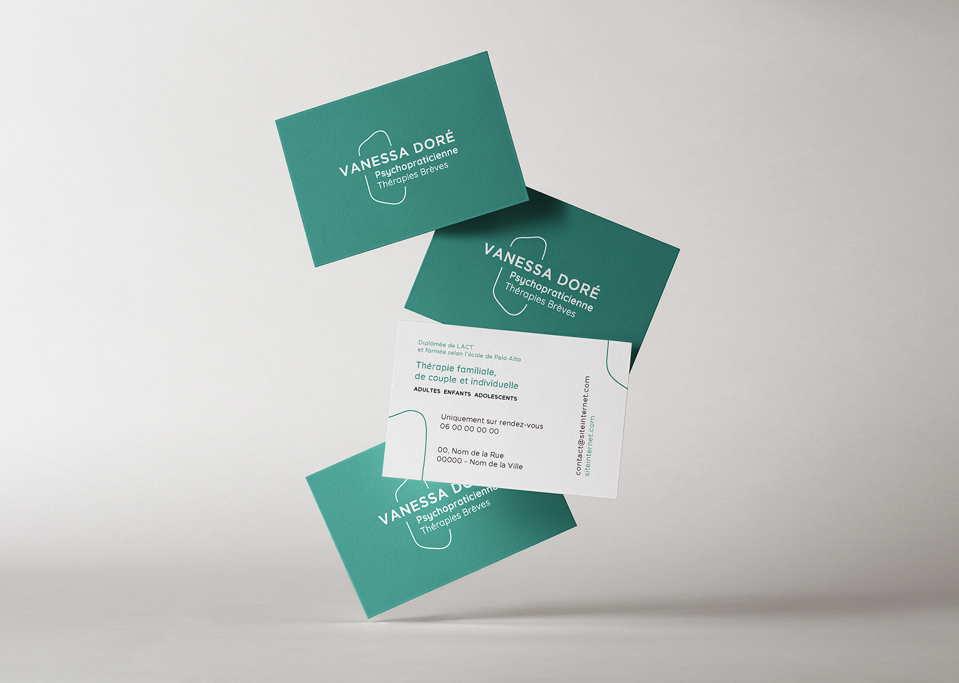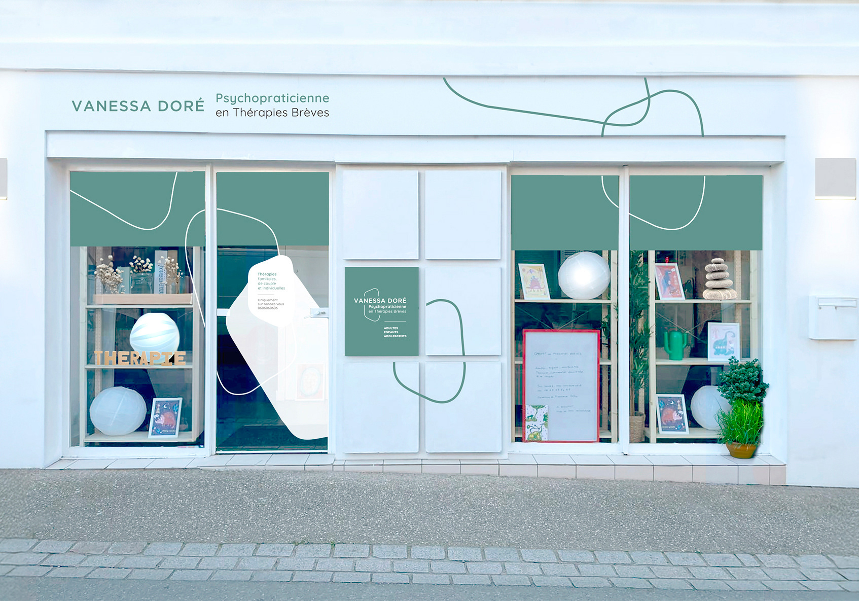 J'ai créé l'identité visuelle et la signalétique du cabinet de Vanessa Doré, psychopraticienne en thérapies brèves.